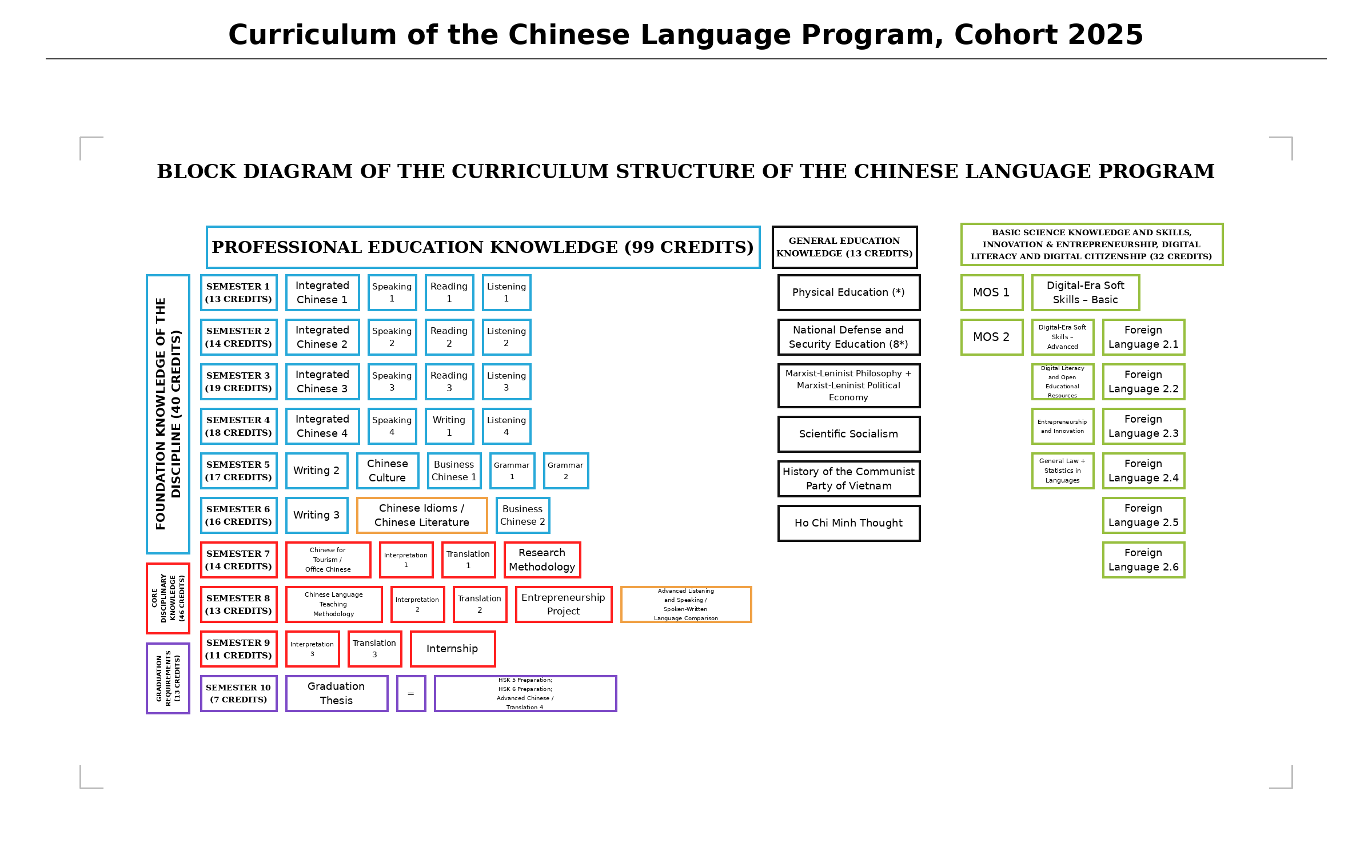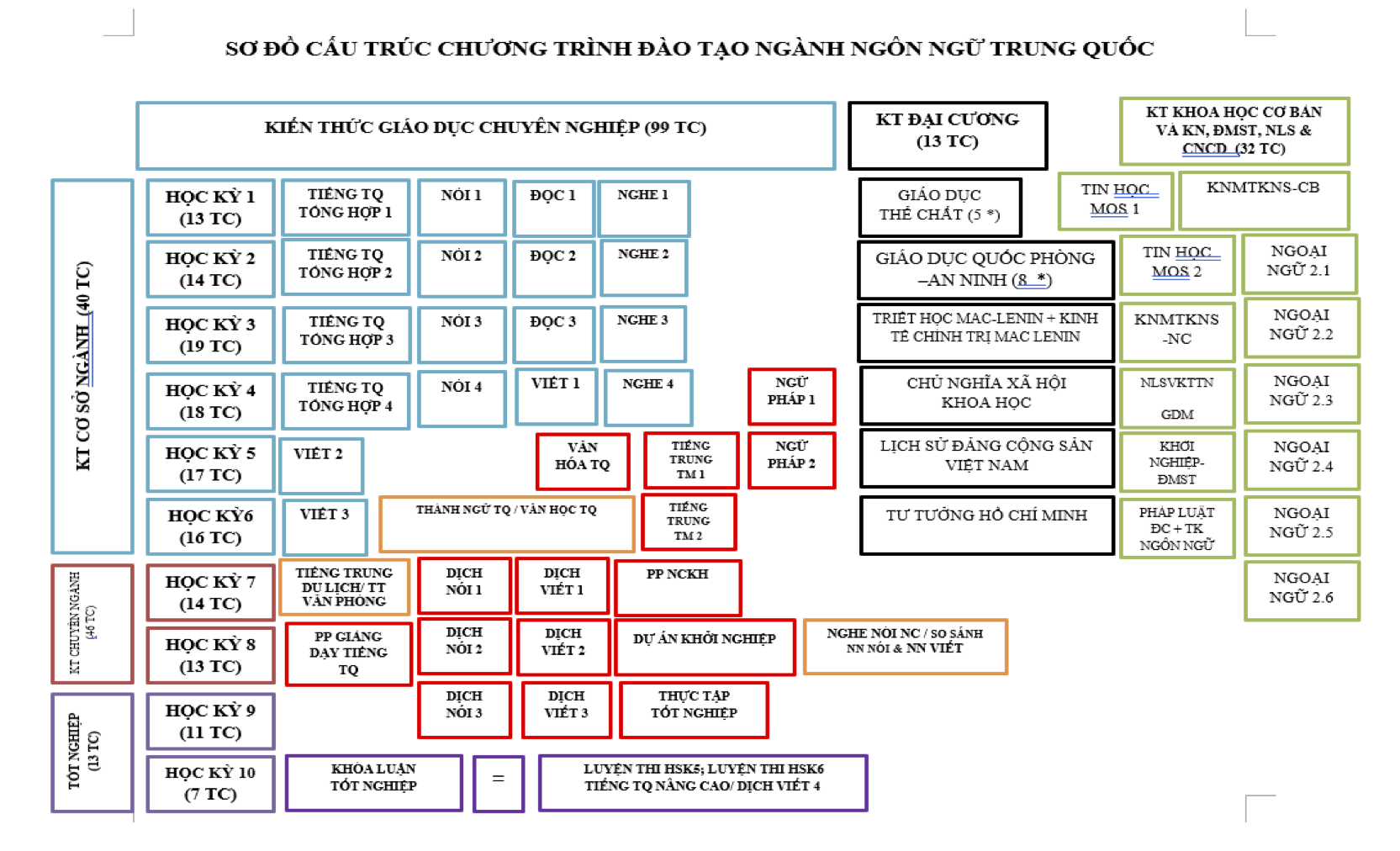 Trong suốt quá trình học, sinh viên được dẫn dắt đào tạo bởi đội ngũ giảng viên giàu kinh nghiệm, tốt nghiệp từ các trường đại học uy tín ở Trung Quốc và Đài Loan – Trung Quốc, giúp sinh viên tiếp cận kiến thức chuẩn quốc tế. Chương trình đào tạo chú trọng phát triển toàn diện các kỹ năng nghe-nói-đọc-viết-đánh máy tiếng Trung Quốc, nhằm phục vụ công việc văn phòng và các công viên đòi hỏi kỹ năng tiếng Trung như phiên dịch hiện trường, giáo viên, hướng dẫn viên…
