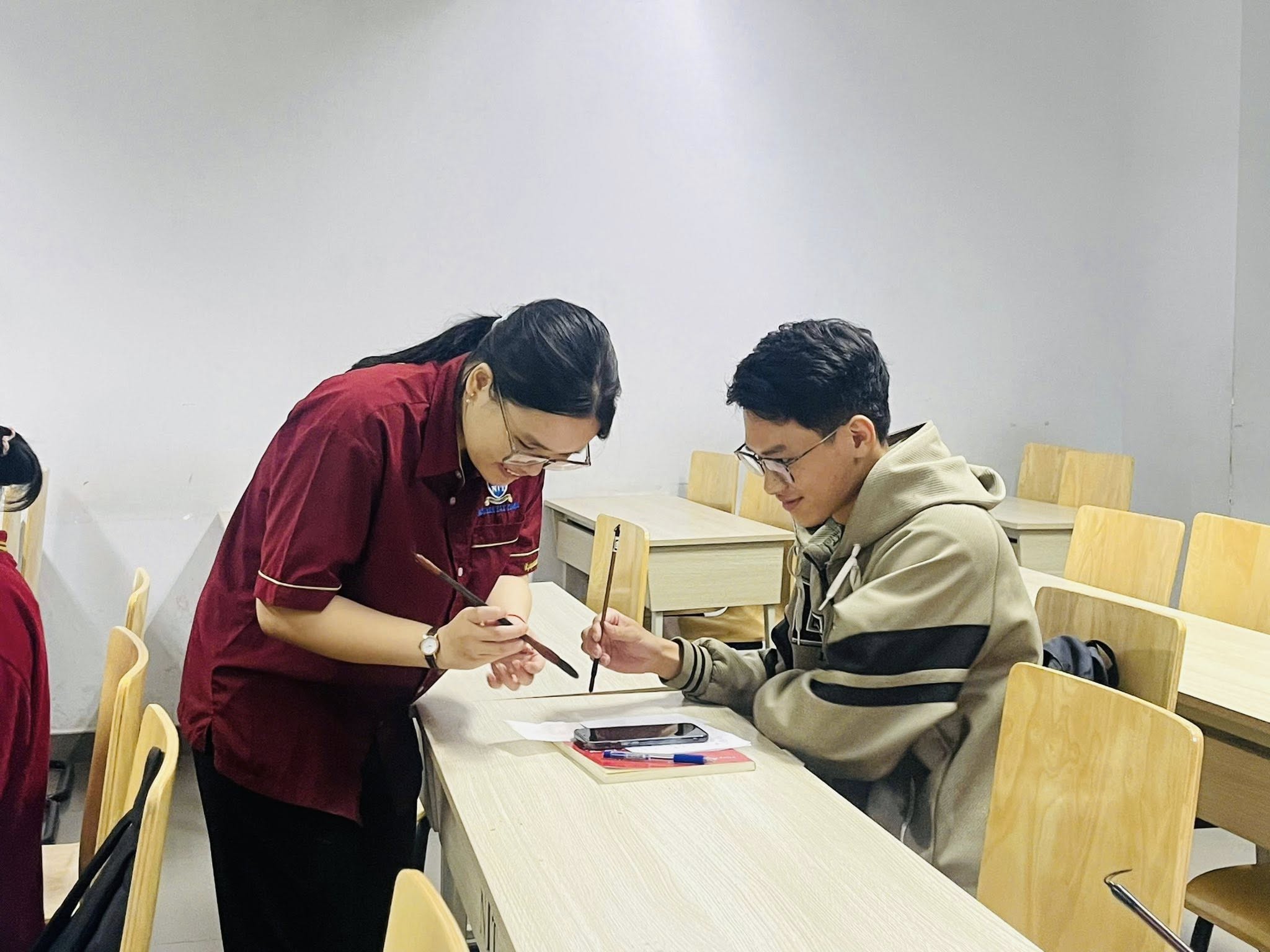 Buổi học được trực tiếp hướng dẫn bởi sinh viên Trần Thị Thanh Tuyền (khóa 2023). Tại đây, các học viên đã được giới thiệu về các dụng cụ cơ bản của nghệ thuật thư pháp như bút lông, mực tàu và giấy viết; đồng thời bước đầu làm quen với những nét bút nền tảng. Dưới sự hướng dẫn tận tình, các bạn sinh viên đã thử sức với những nét chữ đầu tiên, từng bước cảm nhận được sự tinh tế và chiều sâu của nghệ thuật viết chữ Hán.